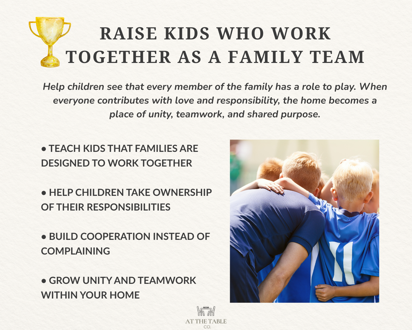 The goal of Working as a Family Team is to help children see their place in the family with confidence and purpose—learning to contribute faithfully, respect different roles, and grow in unity with the people God placed around them.
