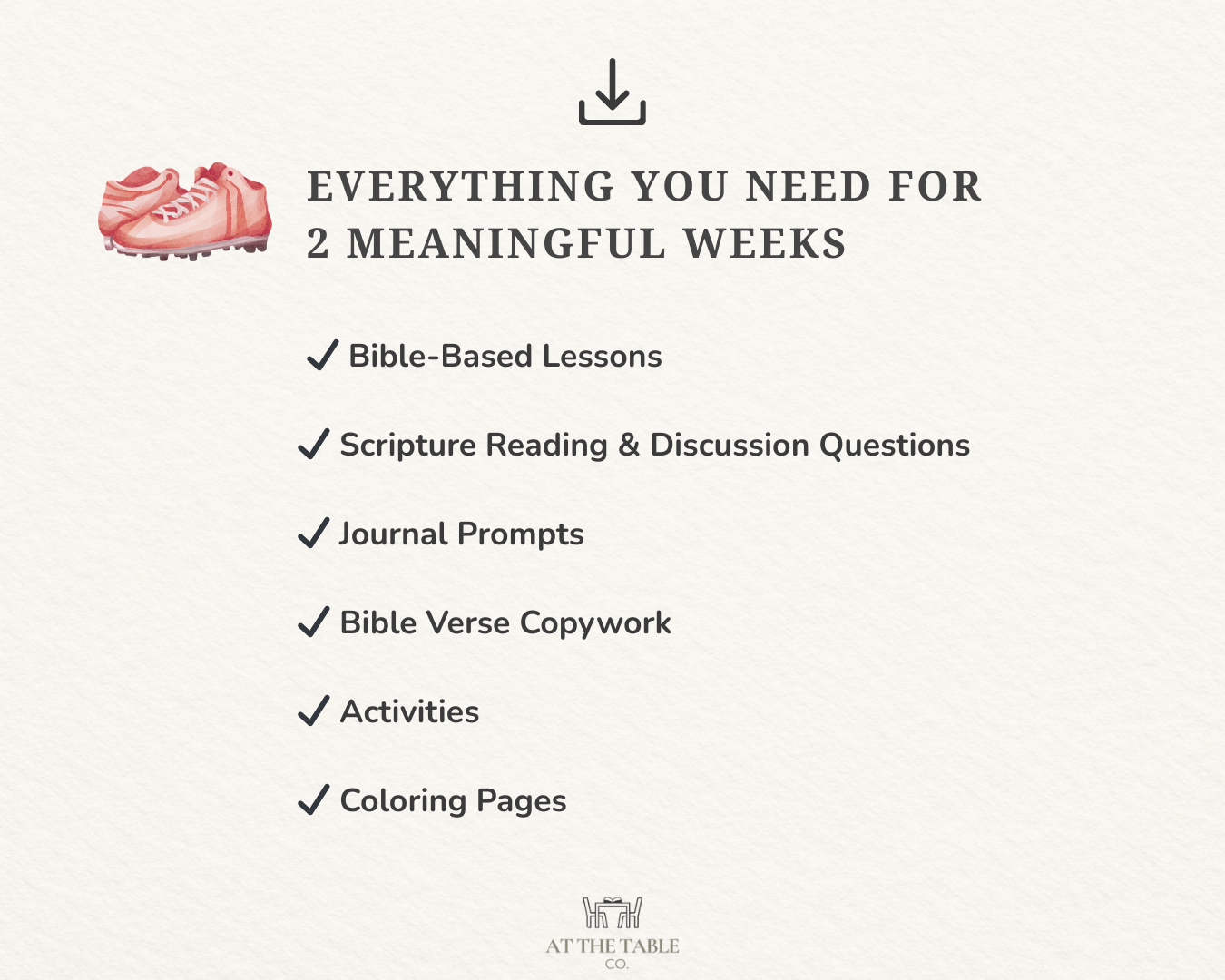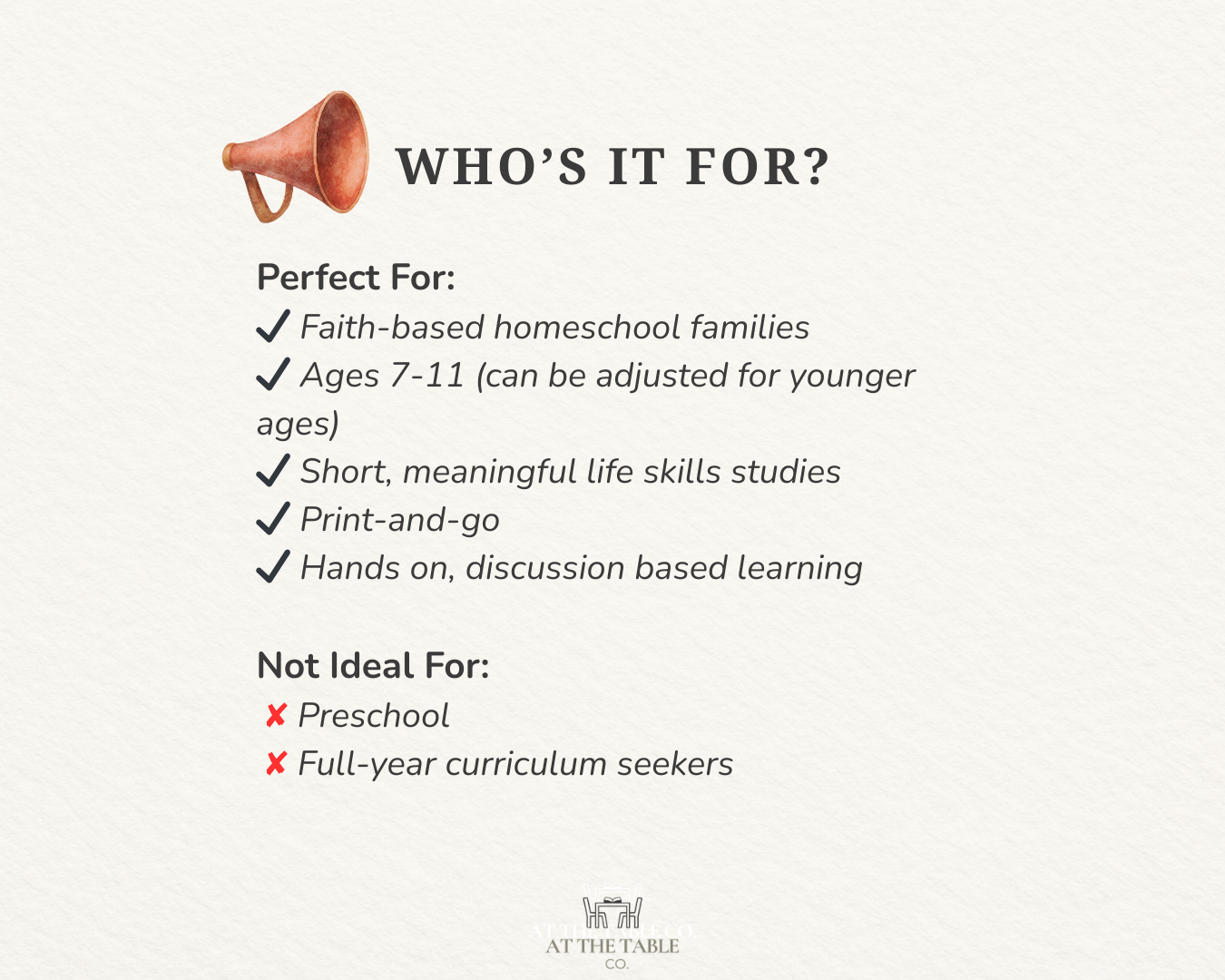 This study focuses on teamwork, attitude, leadership, and gratitude, helping children understand that that God uses each family member in unique ways to build unity and growth.